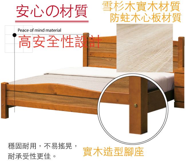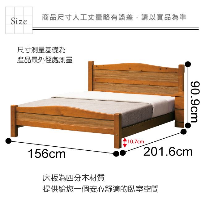 材質 | ◆產品名稱:【綠家居】 梅納 現代5尺雙人實木床台組合(不含床墊) 產品尺寸: 床尺寸:(寬)156x(深)201.6(高)90.9/公分 床架床道可作高低調整使用 ◆材質: 材質:雲杉木實木+防蛀木心板+四分木床板 塗漆:優利坦全包式耐磨噴漆處理 |