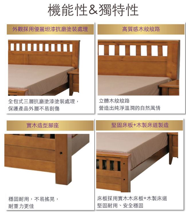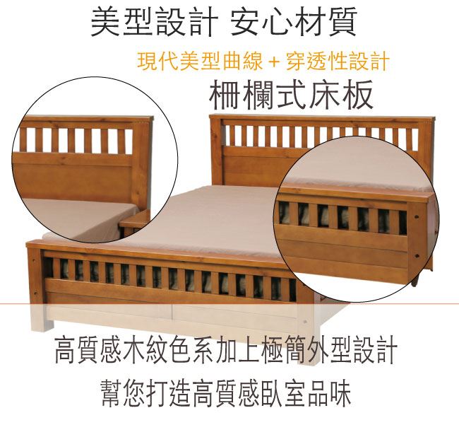 材質 | ◆產品名稱:【綠家居】 坎帕 現代5尺雙人實木床台 產品尺寸: 組合尺寸:(寬)156x(深)206x(高)97/公分 床架床道可作高低調整使用 ◆材質: 材質:松木實木+實木木床板 塗漆:優利坦全包式耐磨噴漆處理 |