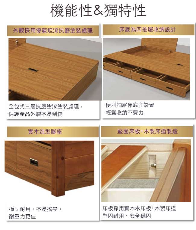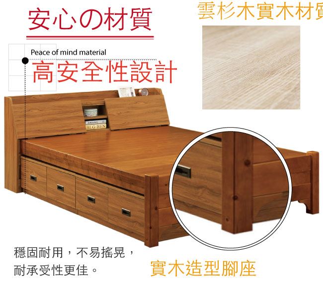 商品介紹 | 【綠家居】維多利 現代5尺雙人實木收納床台組合(床台+床底收納櫃) 樟木紋色系+現代簡約風格+安心材質製造,整體採用雲杉木&松木實木+實木木床板+五金滑軌結構等安心材質製造,外層採用優利坦全包式耐磨噴漆處理搭配採用可掀式床枕板+開放&隱藏式收納層格+四抽屜&可掀底板多功能收納底櫃等便利設計,全由專人配送到家,專業安心服務,替你省下更多時間! 【商品特色】 樟木紋色系+現代簡約風格+安心材質製造,使用放心+搭配居家更便利 採用雲杉木&松木實木+實木木床板+五金滑軌結構等安心材質製造 採用可掀式床枕板+開放&隱藏式收納層格+四抽屜&可掀底板多功能收納底櫃等便利設計 此商品不需要DIY組立,此商品為組立後之成品 品質保證、專業設計、貼心服務 全由專人配送到家,專業安心服務,替您省下更多時間 |