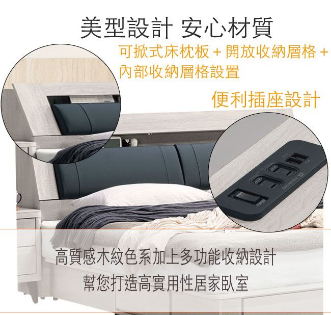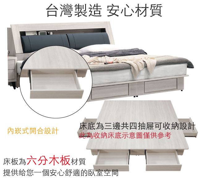 商品介紹 | 【綠家居】蓋爾達 現代6尺雙人加大貓抓皮革四抽床台組合(床頭箱+床底+不含床墊) 橡木紋色系+現代簡約風格+安心材質製造,整體採用防蛀木心板+耐刮貓抓皮革+高密度泡棉+六分木床板+防潮耐磨底座等安心材質製造,外層採用優利坦全包式耐磨噴漆處理搭配採用便利插座設置+可掀式床枕板+開放&隱藏式收納層格+三邊開合收納抽屜等便利設計,全由專人配送到家,專業安心服務,替你省下更多時間! 【商品特色】 橡木紋色系+現代簡約風格+安心材質製造,使用放心+搭配居家更便利 採用防蛀木心板+耐刮貓抓皮革+高密度泡棉+六分木床板+防潮耐磨底座等安心材質製造 採用便利插座設置+可掀式床枕板+開放&隱藏式收納層格+三邊開合收納抽屜等便利設計 此商品不需要DIY組立,此商品為組立後之成品 品質保證、專業設計、貼心服務 全由專人配送到家,專業安心服務,替您省下更多時間 |