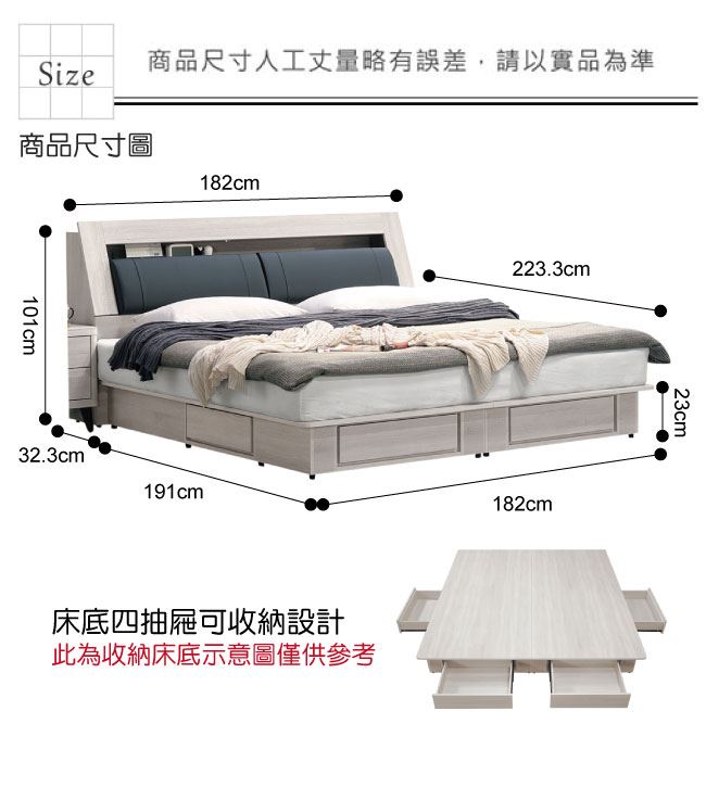 材質 | ◆產品名稱:【綠家居】蓋爾達 現代6尺雙人加大貓抓皮革四抽床台組合(床頭箱+床底+不含床墊) 產品尺寸: 床頭尺寸:(寬)182(深)32.3x(高)101/公分 床底尺寸:(寬)182x(深)191x(高)23/公分 組合尺寸:(寬)182x(深)223.3x(高)101/公分 ◆材質: 材質:防蛀木心板+耐刮貓抓皮革+高密度泡棉+六分木床板+防潮耐磨底座 塗漆:優利坦全包式耐磨噴漆處理 |