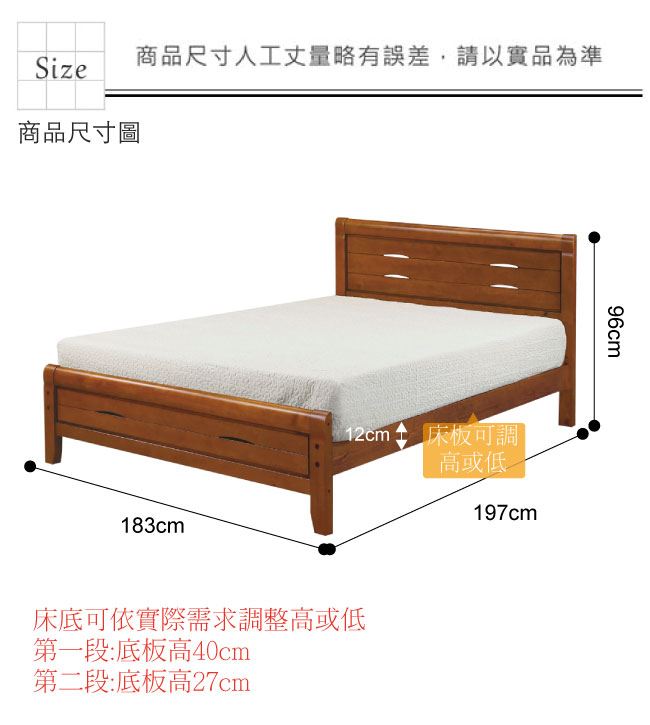 材質 | ◆產品名稱: 【綠家居】卡因 樟木紋6尺雙人加大實木床台(不含床墊) 產品尺寸: 床台尺寸:(寬)183(深)197x(高)96/公分 床板可做二段式高低調整功能性設計 ◆材質: 材質:松木實木+四分木床板+防潮實木底座 塗漆:優利坦全包式耐磨噴漆處理
