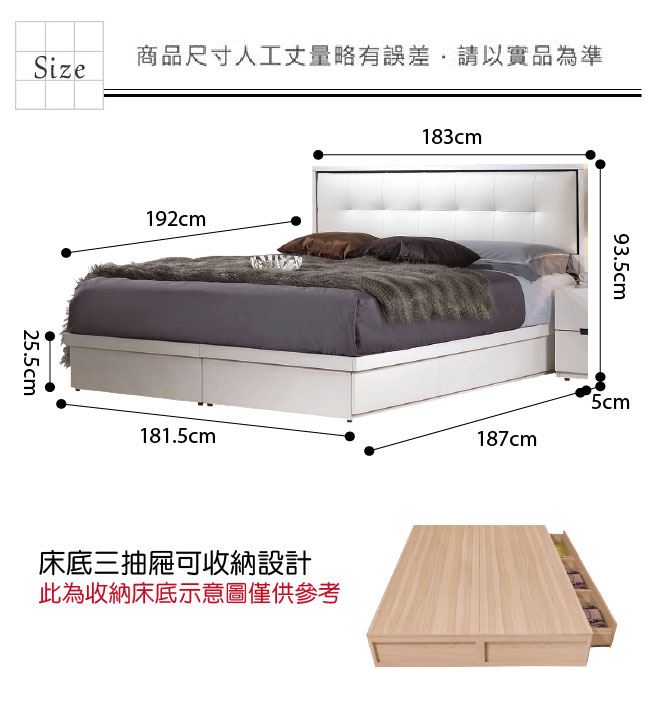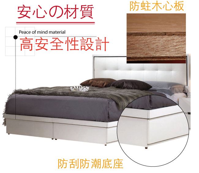 材質 | ◆產品名稱: 【綠家居】律法瑪 現代白6尺雙人加大皮革三抽床台組合(床頭片+三抽床底+不含床墊) 床頭片尺寸:(寬)183x(深)5(高)93.5/公分 床底尺寸:(寬)181.5x(深)187(高)25.5分 組合尺寸:(寬)183x(深)192(高)93.5/公分 ◆材質: 材質:防蛀木心板+六分木床板+透氣柔韌皮革+高密度泡棉+防潮耐磨腳座 噴漆:防潮亮面噴漆處理