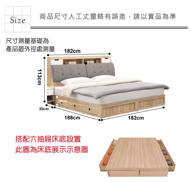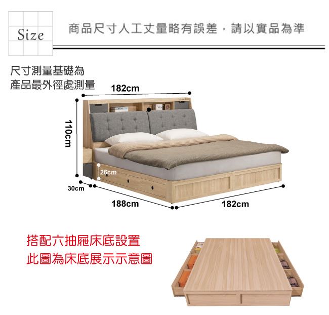 材質 | ◆產品名稱: 【綠家居】科羅利 亞麻布6尺雙人加大六抽床台組合(二色可選+床頭箱+六抽床底+不含床墊) 產品尺寸: 木紋雙色 床頭尺寸:(寬)182(深)30x(高)110/公分 床底尺寸:(寬)182x(深)188x(高)26/公分 組合尺寸:(寬)182x(深)218x(高)110/公分 木紋白雙色 床頭尺寸:(寬)182(深)30x(高)113/公分 床底尺寸:(寬)182x(深)188x(高)26/公分 組合尺寸:(寬)182x(深)218x(高)113/公分 ◆材質: 材質:防蛀木心板+透氣亞麻布+高密度泡棉+六分木床板+防潮耐磨底座 塗漆:優利坦全包式耐磨噴漆處理