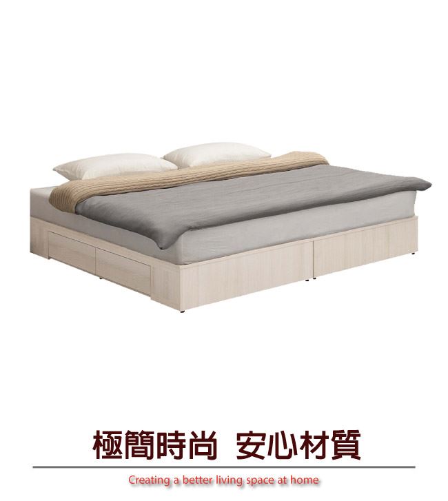 商品 介紹 | 【綠家居】維肯 現代6尺雙人加大四抽床底(不含床墊) 淺橡木紋色系+現代簡約風格+安心材質製造,整體採用防蛀木心板+六分木床板+防潮耐磨底座等安心材質製造,外層採用優利坦全包式耐磨噴漆處理搭配採用雙邊開合收納四抽屜便利設計,全由專人配送到家,專業安心服務,替你省下更多時間! 【商品特色】 淺橡木紋色系+現代簡約風格+安心材質製造,使用放心+搭配居家更便利 採用防蛀木心板+六分木床板+防潮耐磨底座等安心材質製造 採用雙邊開合收納四抽屜便利設計 此商品不需要DIY組立,此商品為組立後之成品 品質保證、專業設計、貼心服務 全由專人配送到家,專業安心服務,替您省下更多時間 |