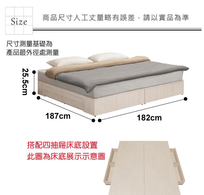 材質 | ◆產品名稱: 【綠家居】維肯 現代6尺雙人加大四抽床底(不含床墊) 產品尺寸: 床底尺寸:(寬)182x(深)187x(高)25.5/公分 ◆材質: 材質:防蛀木心板+六分木床板+防潮耐磨底座 塗漆:優利坦全包式耐磨噴漆處理