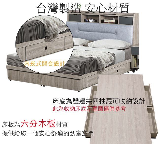 商 品 介 紹 | 【綠家居】佩芮 現代6尺雙人加大貓抓皮革四抽床台組合(床頭箱+四抽床底+不含床墊) 橡木紋色系+現代簡約風格+安心材質製造,整體採用防蛀木心板+耐刮貓抓皮革+高密度泡棉+六分木床板+防潮耐磨底座等安心材質製造,外層採用優利坦全包式耐磨噴漆處理搭配採用可掀式床頭枕板+開放&隱藏式收納層格+雙抽格床頭+便利插座設置+雙邊開合收納四抽屜等便利設計,全由專人配送到家,專業安心服務,替你省下更多時間! 【商品特色】 橡木紋色系+現代簡約風格+安心材質製造,使用放心+搭配居家更便利 採用防蛀木心板+耐刮貓抓皮革+高密度泡棉+六分木床板+防潮耐磨底座等安心材質製造 採用可掀式床頭枕板+開放&隱藏式收納層格+雙抽格床頭+便利插座設置+雙邊開合收納四抽屜等便利設計 此商品不需要DIY組立,此商品為組立後之成品 品質保證、專業設計、貼心服務 全由專人配送到家,專業安心服務,替您省下更多時間 |