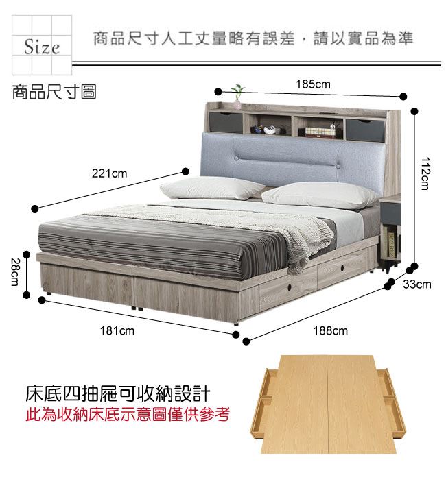 材質 | ◆產品名稱: 【綠家居】佩芮 現代6尺雙人加大貓抓皮革四抽床台組合(床頭箱+四抽床底+不含床墊) 產品尺寸: 木紋雙色 床頭尺寸:(寬)185(深)33x(高)112/公分 床底尺寸:(寬)181x(深)188x(高)28/公分 組合尺寸:(寬)185x(深)221x(高)112/公分 ◆材質: 材質:防蛀木心板+耐刮貓抓皮革+高密度泡棉+六分木床板+防潮耐磨底座 塗漆:優利坦全包式耐磨噴漆處理