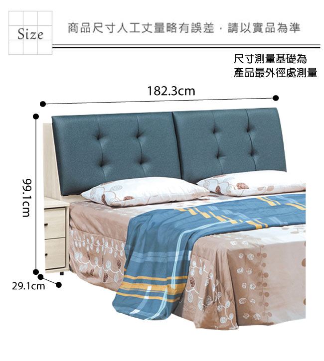 床頭箱尺寸:(寬)182.3x(深)29.1(高)99.1/公分 ◆材質: 材質:防蛀木心板+防刮貓抓皮革+高密度泡棉 噴漆:防潮耐磨噴漆處理