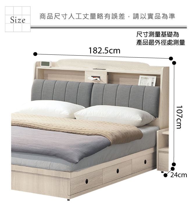 床頭箱尺寸:(寬)182.5x(深)24(高)107/公分 ◆材質: 材質:防蛀木心板+防刮貓抓皮革+高密度泡棉 噴漆:防潮耐磨噴漆處理