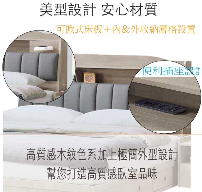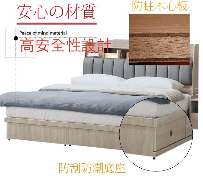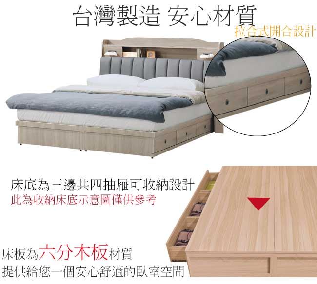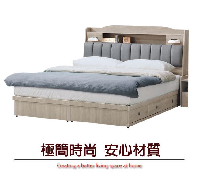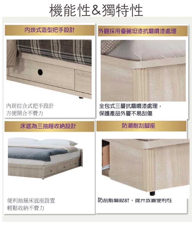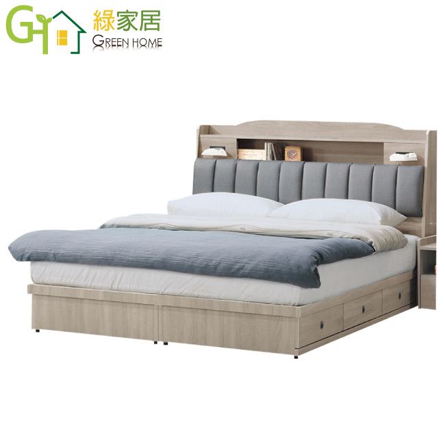 商 品 介 紹 | 【綠家居】毛利6尺雙人加大貓抓皮革三抽床台組合(床頭箱+三抽床底+不含床墊) 深橡木紋色系+現代簡約風格+安心材質製造,整體採用防蛀木心板+六分木床板+防刮貓抓皮革+高密度泡棉+防潮耐磨腳座等安心材質製造,產品外層採用防潮耐磨噴漆處理搭配採用可掀式床枕板+內&外開放層格+單抽格+便利插座設置+單邊開合三抽屜床底等收納空間設計,全由專人配送到家,專業安心服務,替你省下更多時間! 【商品特色】 深橡木紋色系+現代簡約風格+安心材質製造,使用放心+搭配居家更便利 採用防蛀木心板+六分木床板+防刮貓抓皮革+高密度泡棉+防潮耐磨腳座等安心材質製造 產品外層採用防潮耐磨噴漆處理 搭配採用可掀式床枕板+內&外開放層格++單抽格+便利插座設置+單邊開合三抽屜床底等收納空間設計 此商品不需要DIY組立,此商品為組立後之成品 品質保證、專業設計、貼心服務 全由專人配送到家,專業安心服務,替您省下更多時間 |