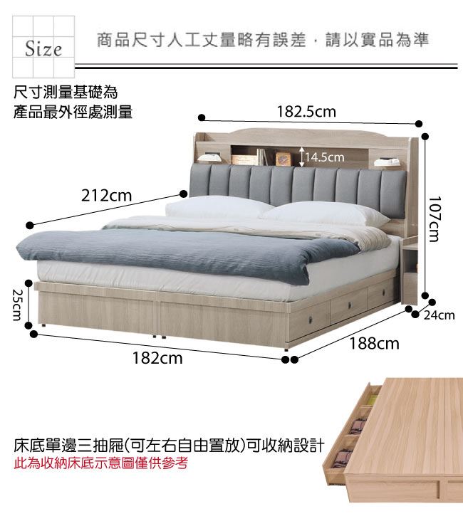 床頭箱尺寸:(寬)182.5x(深)24(高)107/公分 床底尺寸:(寬)182x(深)188(高)25/公分 組合尺寸:(寬)182.5x(深)212(高)107/公分 ◆材質: 材質:防蛀木心板+六分木床板+防刮貓抓皮革+高密度泡棉+防潮耐磨腳座 噴漆:防潮耐磨噴漆處理