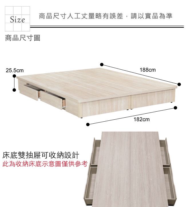 床底尺寸:(寬)182x(深)188高)25.5公分 ◆材質: 材質:防蛀木心板+六分木床板+防潮耐磨腳座 噴漆:防潮耐磨噴漆處理