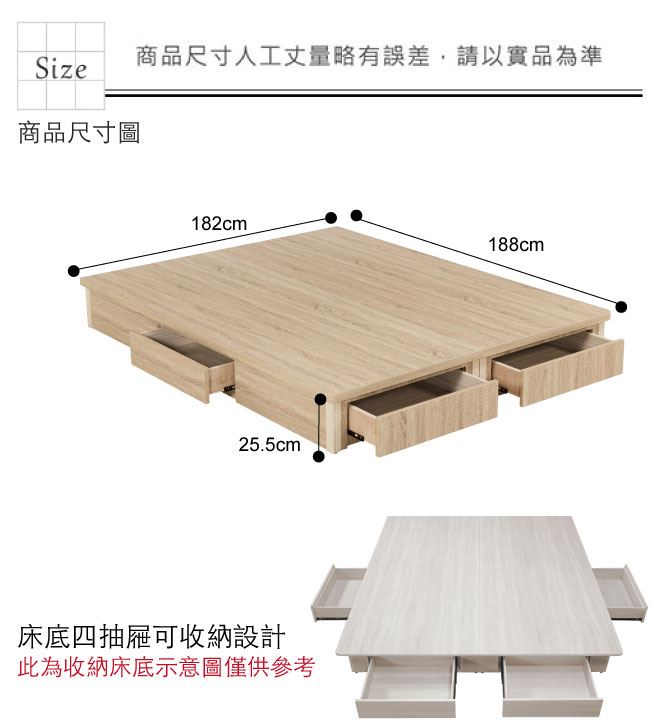 床底尺寸:(寬)182x(深)188高)25.5公分 ◆材質: 材質:防蛀木心板+六分木床板+防潮耐磨腳座 噴漆:防潮耐磨噴漆處理
