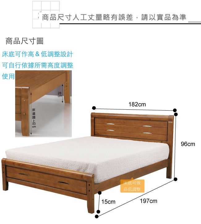 產品名稱:【綠家居】可朵 檜木紋6尺雙人加大實木床台(不含床墊) 產品尺寸: 床台尺寸:(寬)182(深)197x(高)96/公分 床板高度可做高40cm&低28cm二段式調整設計 ◆材質: 材質:松木實木+四分木床板+防潮實木底座 塗漆:優利坦全包式耐磨噴漆處理