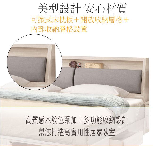商 品 介 紹 | 【綠家居】普米里6尺雙人加大貓抓皮革床頭箱(不含床底+不含床墊) 淺橡木紋色系+現代簡約風格+安心材質製造,整體採用防蛀木心板+防刮貓抓皮革+高密度泡棉等安心材質製造,產品外層採用防潮耐磨噴漆處理搭配採用可掀式床枕板+內&外開放層格等收納空間設計,全由專人配送到家,專業安心服務,替你省下更多時間! 【商品特色】 淺橡木紋色系+現代簡約風格+安心材質製造,使用放心+搭配居家更便利 採用防蛀木心板+防刮貓抓皮革+高密度泡棉等安心材質製造 產品外層採用防潮耐磨噴漆處理 搭配採用可掀式床枕板+內&外開放層格等收納空間設計 此商品不需要DIY組立,此商品為組立後之成品 品質保證、專業設計、貼心服務 全由專人配送到家,專業安心服務,替您省下更多時間