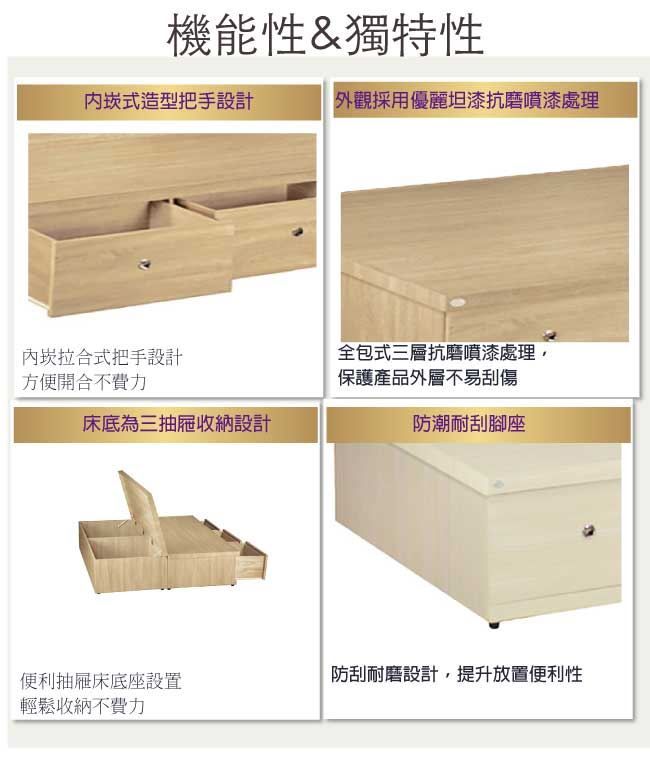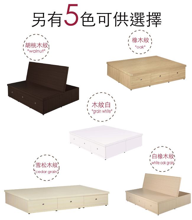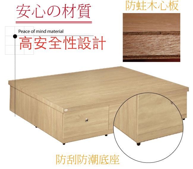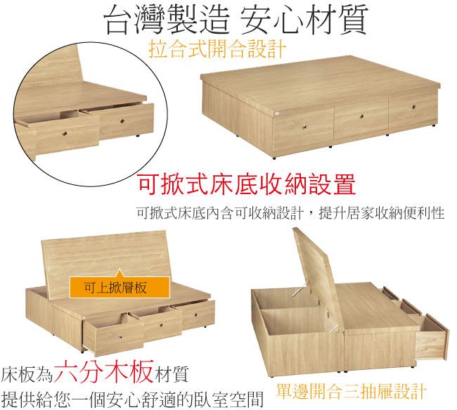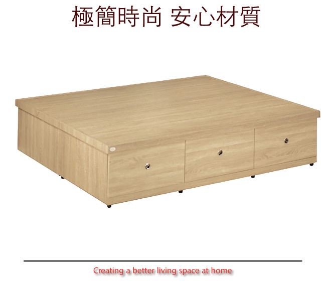 商 品 介 紹 | 【綠家居】杜安6尺雙人加大三抽可掀式機能高床底(五色可選) 五色可選+現代簡約風格+安心材質製造,整體採用防蛀木心板+六分木床板+防刮耐磨底座+五金滑軌結構+掀式防護五金結構等安心材質製造,產品外層採用防潮耐磨噴漆處理搭配床底為單邊開合三抽屜&可掀式床底板+內置收納層格等收納空間設計,全由專人配送到家,專業安心服務,替你省下更多時間! 【商品特色】 五色可選+現代簡約風格+安心材質製造,使用放心+搭配居家更便利 採用防蛀木心板+六分木床板+防刮耐磨底座+五金滑軌結構+掀式防護五金結構等安心材質製造 產品外層採用防潮耐磨噴漆處理 搭配採用床底為單邊開合三抽屜&可掀式床底板+內置收納層格等收納空間設計 此商品不需要DIY組立,此商品為組立後之成品 品質保證、專業設計、貼心服務 全由專人配送到家,專業安心服務,替您省下更多時間