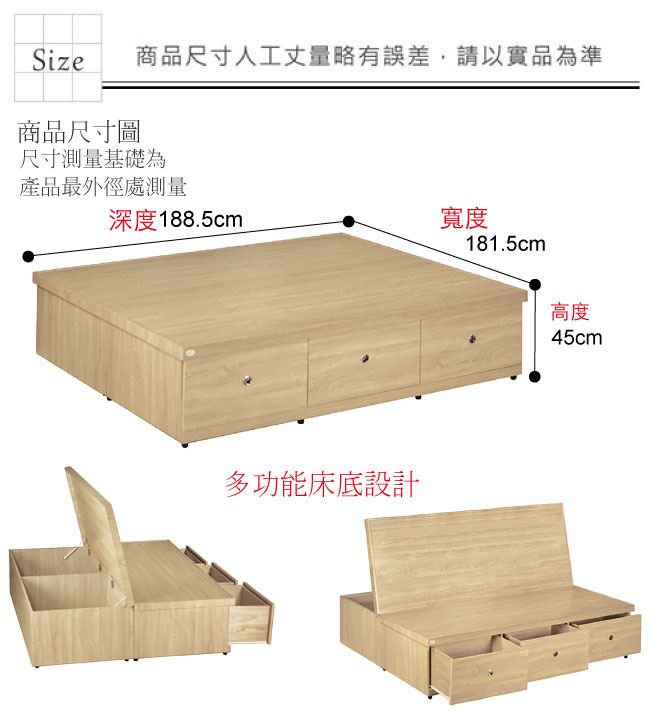 材質 | ◆產品名稱:【綠家居】杜安6尺雙人加大三抽可掀式機能高床底(五色可選) 床底尺寸:(寬)181.5x(深)188.5(高)45/公分 ◆材質: 材質:防蛀木心板+六分木床板+防刮耐磨底座+五金滑軌結構+掀式防護五金結構 噴漆:防潮耐磨噴漆處理