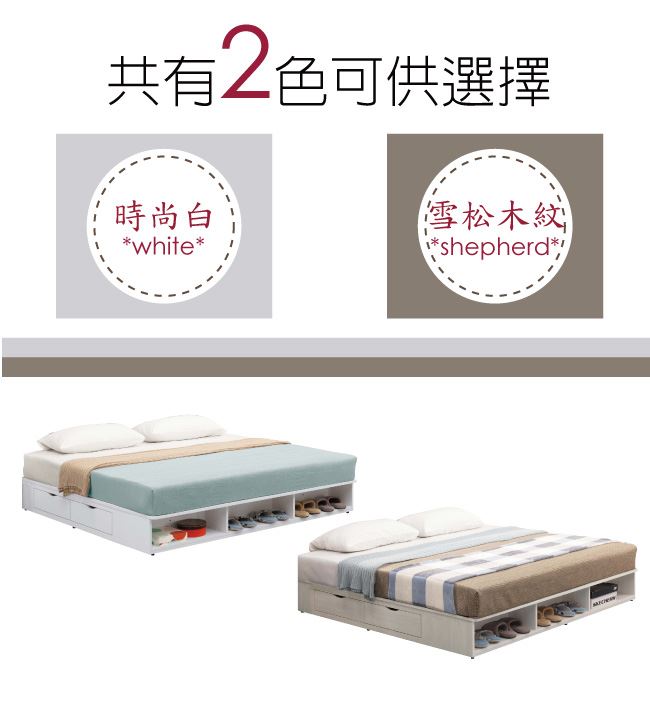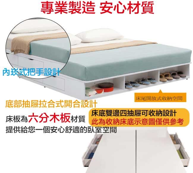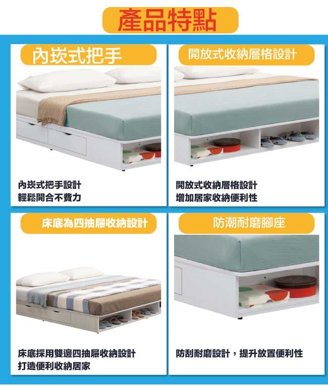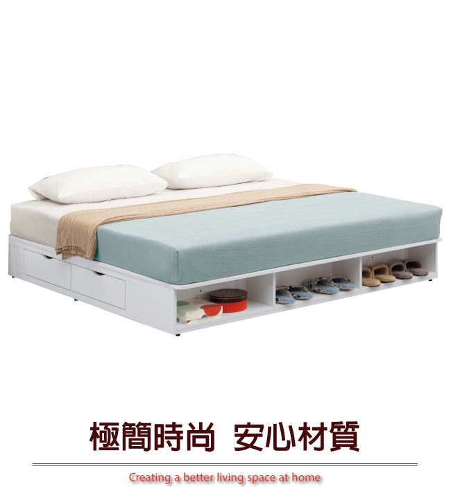 商品 介紹 | 【綠家居】培亞6尺雙人加大雙邊四抽床底(二色可選+不含床墊) 二色可選+現代簡約風格+安心材質製造,整體採用防蛀木心板+六分木床板+防刮耐磨底座等安心材質製造,產品外層採用防潮亮面&耐磨噴漆處理搭配採用床底為雙邊開合四抽屜收納空間設計,全由專人配送到家,專業安心服務,替你省下更多時間! 【商品特色】 二色可選+現代簡約風格+安心材質製造,使用放心+搭配居家更便利 採用防蛀木心板+六分木床板+防刮耐磨底座等安心材質製造 產品外層採用防潮亮面&耐磨噴漆處理 搭配採用床底為雙邊開合四抽屜收納空間設計 此商品不需要DIY組立,此商品為組立後之成品 品質保證、專業設計、貼心服務 全由專人配送到家,專業安心服務,替您省下更多時間 |