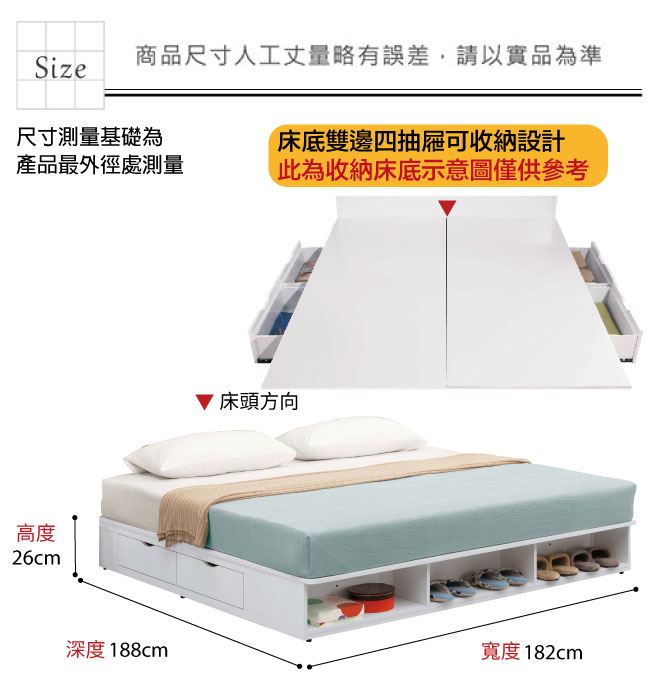 材質 | ◆產品名稱:【綠家居】培亞6尺雙人加大雙邊四抽床底(二色可選+不含床墊) 床底尺寸:(寬)182x(深)188(高)26/公分 ◆材質: 材質:防蛀木心板+六分木床板+防刮耐磨底座 噴漆:防潮亮面&耐磨噴漆處理
