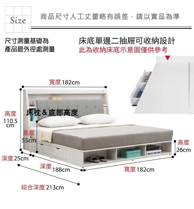 材質 | ◆產品名稱:【綠家居】利伯維6尺雙人加大亞麻布二抽床台組合(床頭箱+二抽床底+不含床墊) 床頭尺寸:(寬)182x(深)25(高)110.5/公分 床底尺寸:(寬)182x(深)188(高)26/公分 床台組合尺寸:(寬)182x(深)218(高)110.5/公分 ◆材質: 材質:防蛀木心板+透氣亞麻布+高密度泡棉+六分木床板+防刮耐磨底座 噴漆:防潮耐磨噴漆處理
