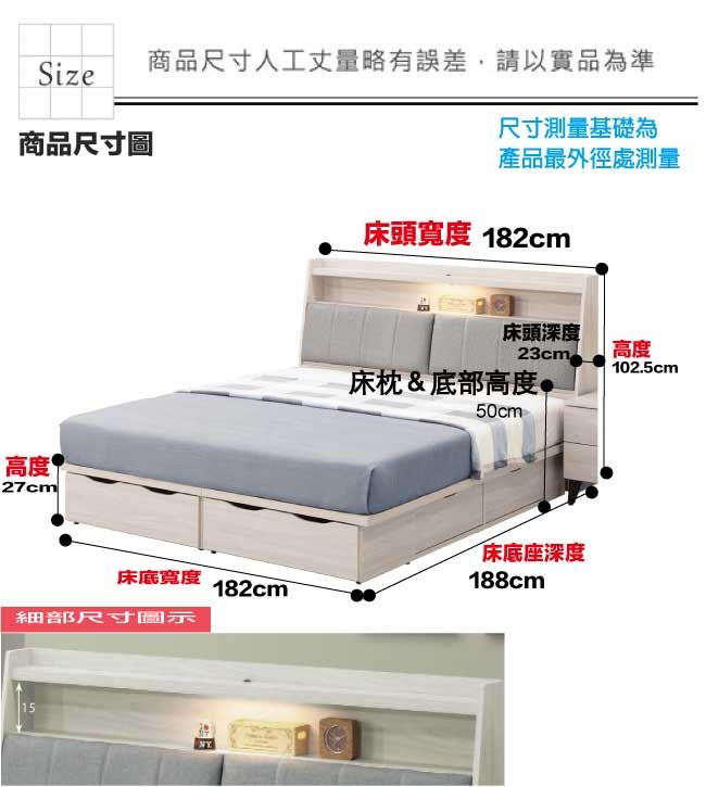 材質 | ◆產品名稱:【綠家居】布金6尺貓抓皮革雙人加大六抽床台組合(床頭箱+六抽床底+不含床墊) 床頭尺寸:(寬)182x(深)23(高)102.5/公分 床底尺寸:(寬)182x(深)188(高)27/公分 床台組合尺寸:(寬)182x(深)211(高)102.5/公分 ◆材質: 材質:防蛀木心板+六分木床板+防潮耐磨腳座+透氣耐磨皮革+高密度泡棉 噴漆:防潮耐磨噴漆處理