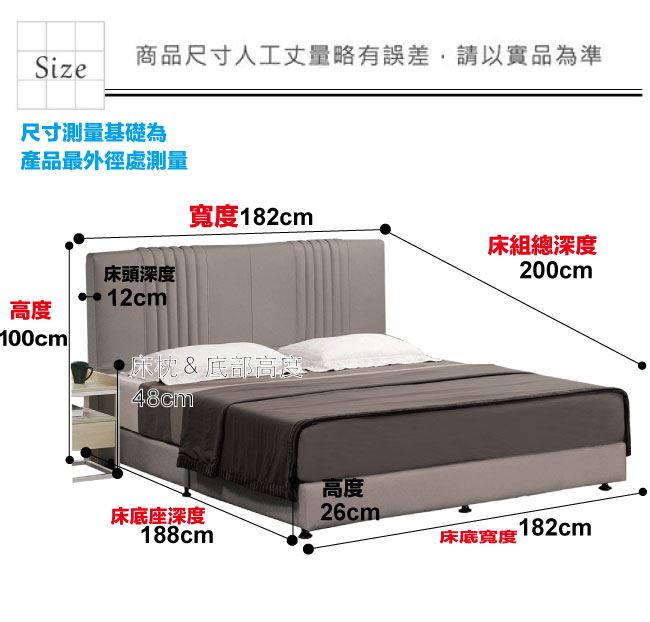 材質 | ◆產品名稱:【綠家居】艾布6尺貓抓皮革雙人加大床台組合(床頭片+床底+不含床墊) 床頭尺寸:(寬)182x(深)12(高)100/公分(內凹式) 床底尺寸:(寬)182x(深)188(高)26/公分 床台組合尺寸:(寬)182x(深)200(高)100/公分 ◆材質: 材質:內置實木骨架+防潮亮面腳座+耐磨貓抓皮革+高密度泡棉+止滑天鵝絨布