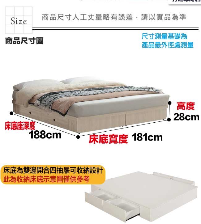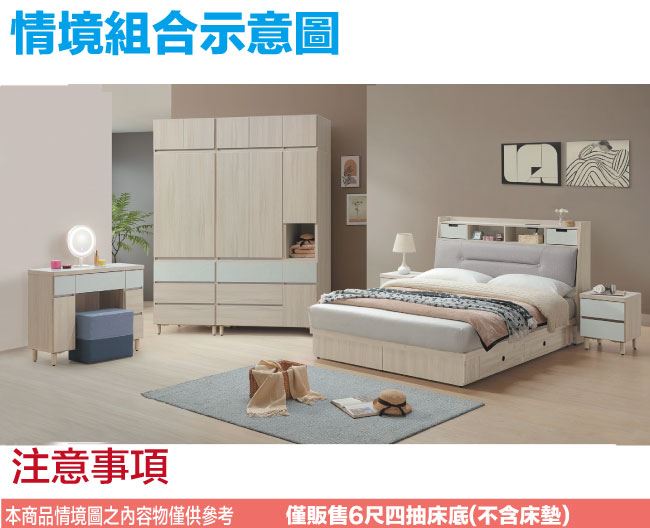 商 品 介 紹 | 【綠家居】馬蘭6尺雙人加大四抽床底(不含床墊) 白榆木紋色系+現代簡約風格+安心材質製造,整體採用防蛀木心板+六分木床板+防潮耐磨腳座等安心材質製造,產品外層採用防潮耐磨噴漆處理搭配採用床底雙邊開合四抽屜收納空間設計,全由專人配送到家,專業安心服務,替你省下更多時間! 【商品特色】 白榆木紋色系+現代簡約風格+安心材質製造,使用放心+搭配居家更便利 採用防蛀木心板+六分木床板+防潮耐磨腳座等安心材質製造 產品外層採用防潮耐磨噴漆處理 搭配採用床底雙邊開合四抽屜收納空間設計此商品不需要DIY組立,此商品為組立後之成品 品質保證、專業設計、貼心服務 全由專人配送到家,專業安心服務,替您省下更多時間