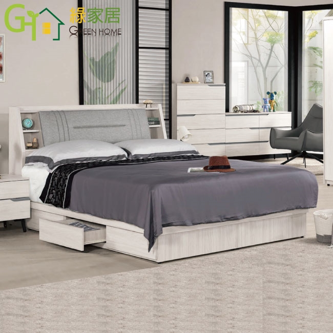 搭配床頭可掀式床枕板+內&外開放層格+便利插座設置+床底座單邊開合三抽屜等收納空間設計