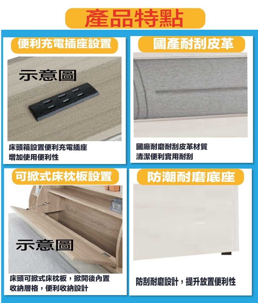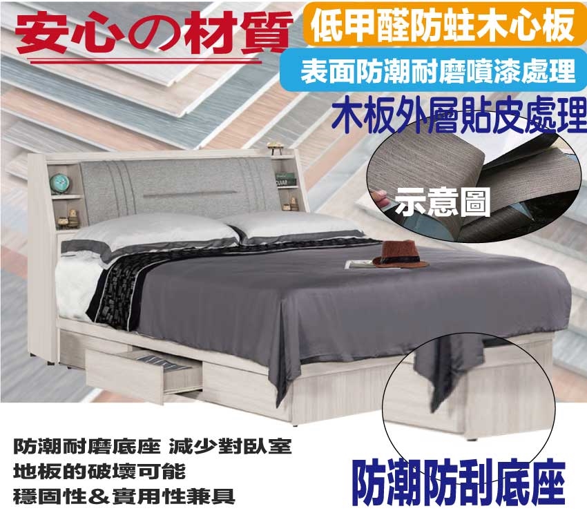 材質:防蛀木心板+六分木床板+防潮耐磨底座+耐磨耐刮皮革+高回彈泡棉