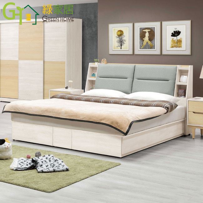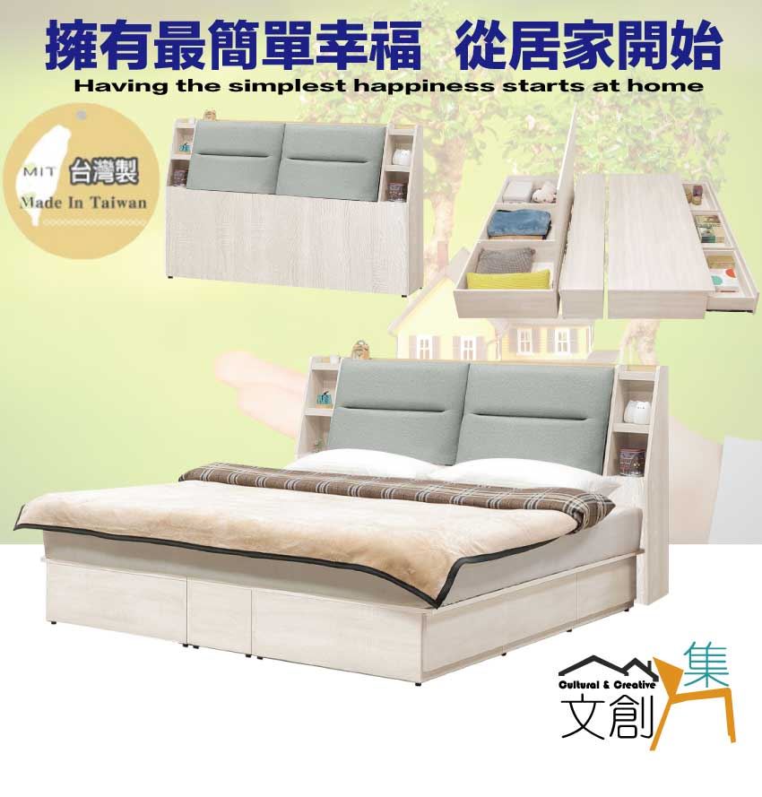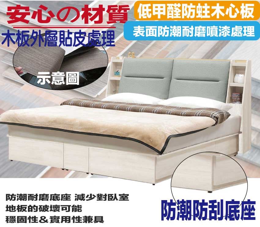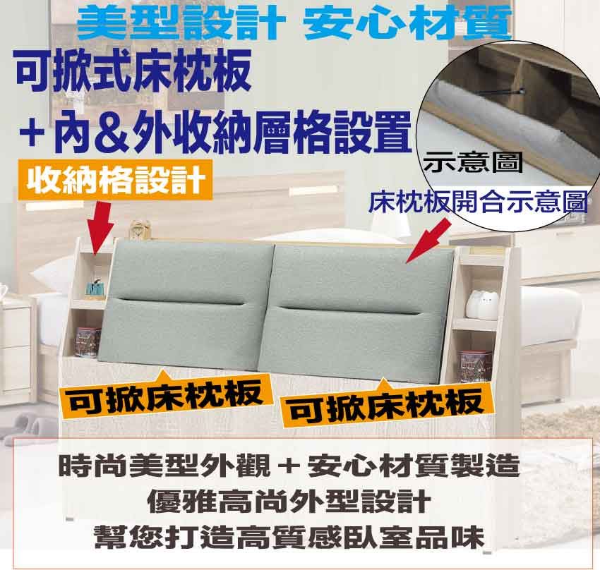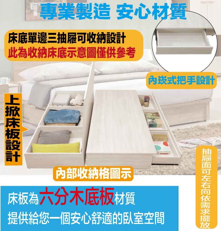 搭配床頭可掀式床枕板+內&外開放層格+床底座單邊開合三抽屜+床底板可上掀內可置物等收納空間設計