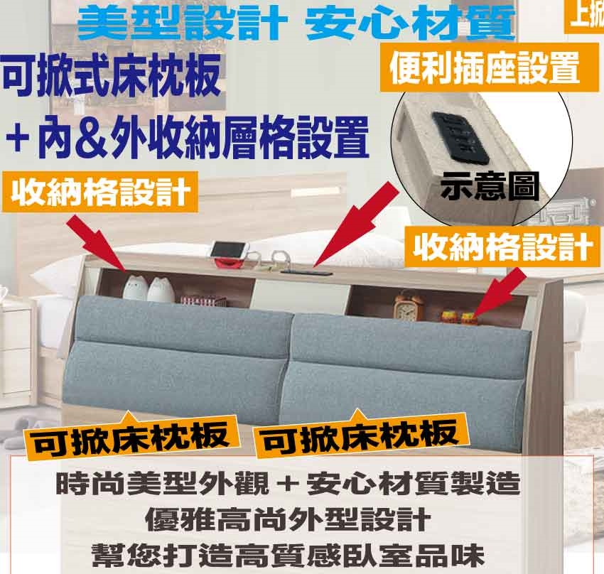 可掀式床枕板+內&外收納空間