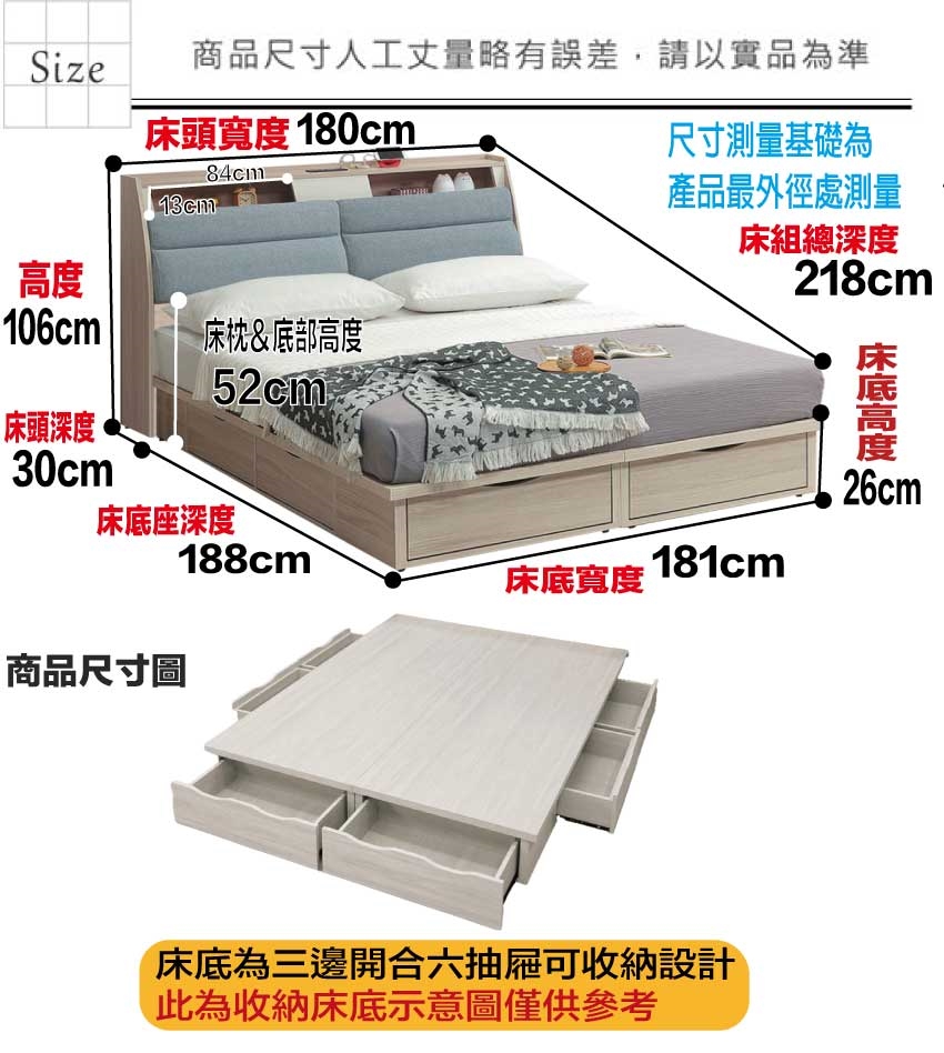 床頭尺寸:(寬)180x(深)30x(高)106/公分