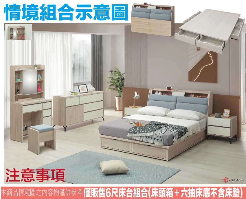 搭配床頭箱可掀式床枕板+內&外收納層格+便利插座設置+床底座三邊開合六抽屜等收納空間設計