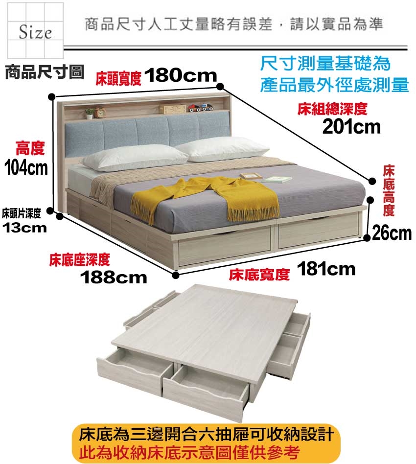 床頭尺寸:(寬)180x(深)13x(高)104/公分