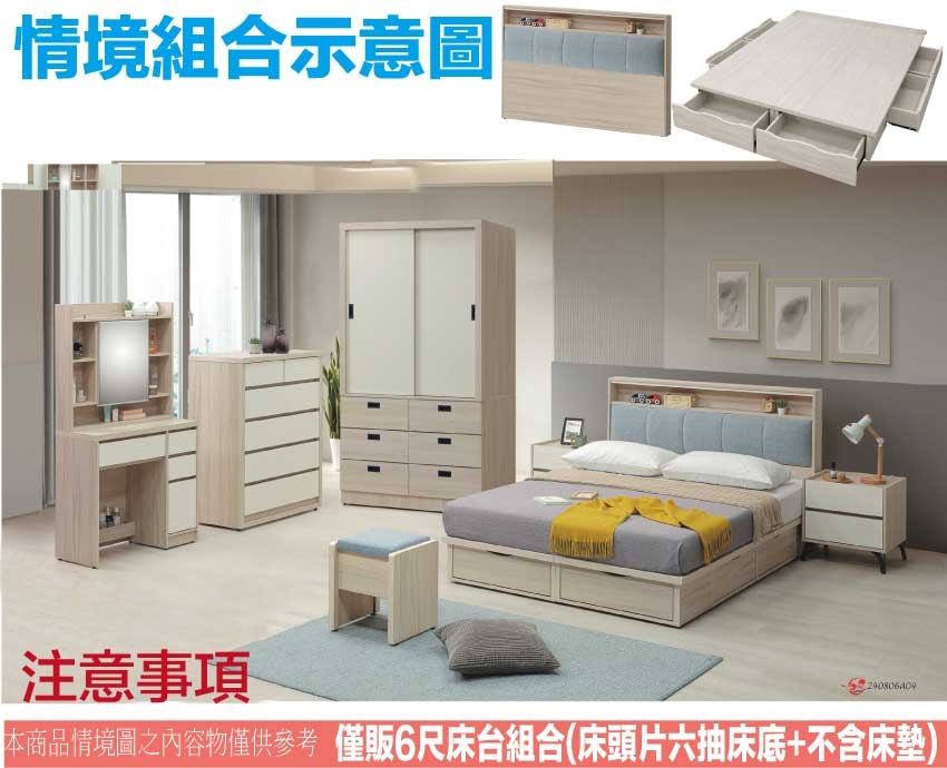 - ◆產品名稱:【綠家居】美斯六抽6尺雙人加大貓抓布床台組合(床頭片+六抽床底+不含床墊)