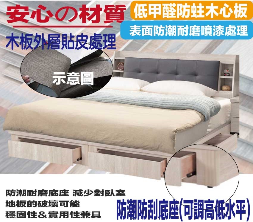 ★偏遠地區需額外加收運費,下標請先問與答詢問★ ★下訂前注意 由於商品流動較快,下訂前請先詢問是否有貨在下訂喔~★ 【綠家居】凱曼6尺雙人加大貓抓皮革四抽床台組合(床頭箱+四抽床底+不含床墊) 淺橡木紋色系+現代簡約風格+安心材質製造,整體採用防蛀木心板+六分木床板+防潮耐磨底座+耐磨貓抓皮革+高回彈泡棉等安心材質製造,產品外層採用防潮耐磨噴漆處理搭配採用床頭箱可掀式床枕板+內&外收納層格+便利插座設置+床底座三邊開合四抽屜等收納空間設計,全由專人配送到家,專業安心服務,替你省下更多時間!