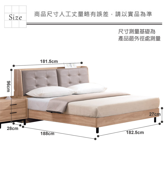 床頭箱:(寬)181.5x (深)28x(高)96 / 公分