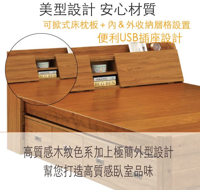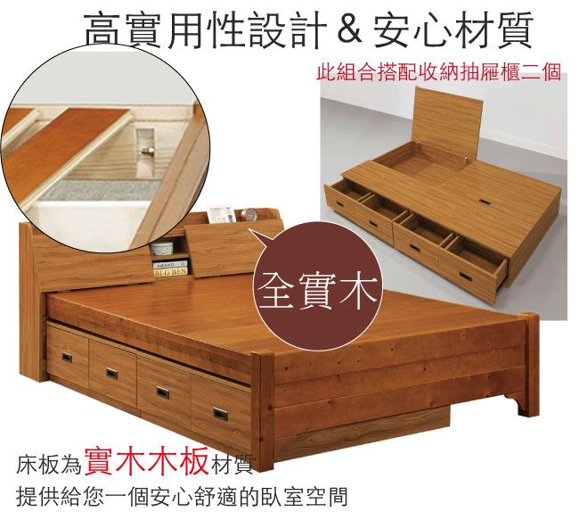 商品介紹 | 【綠家居】維多利 現代6尺雙人加大實木收納床台組合(床台+床底收納櫃) 樟木紋色系+現代簡約風格+安心材質製造,整體採用雲杉木&松木實木+實木木床板+五金滑軌結構等安心材質製造,外層採用優利坦全包式耐磨噴漆處理搭配採用可掀式床枕板+開放&隱藏式收納層格+四抽屜&可掀底板多功能收納底櫃等便利設計,全由專人配送到家,專業安心服務,替你省下更多時間! 【商品特色】 樟木紋色系+現代簡約風格+安心材質製造,使用放心+搭配居家更便利 採用雲杉木&松木實木+實木木床板+五金滑軌結構等安心材質製造 採用可掀式床枕板+開放&隱藏式收納層格+四抽屜&可掀底板多功能收納底櫃等便利設計 此商品不需要DIY組立,此商品為組立後之成品 品質保證、專業設計、貼心服務 全由專人配送到家,專業安心服務,替您省下更多時間 |