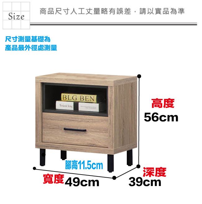 材質 | ◆產品名稱:【綠家居】克蘿1.6尺單抽床頭櫃 尺寸:(寬)49x(深)39x(高)56/公分 ◆材質: 材質:防蛀木心板+五金滑軌結構+烤漆金屬腳座 噴漆:防潮耐磨噴漆處理 |