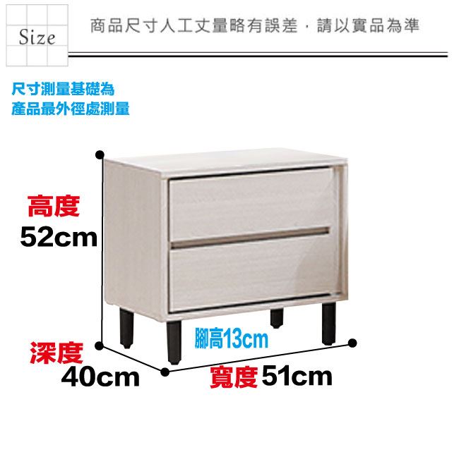 材質 | ◆產品名稱:【綠家居】萊迪1.7尺二抽床頭櫃 尺寸:(寬)51x(深)40x(高)52/公分 ◆材質: 材質:防蛀木心板+五金滑軌結構+烤漆金屬腳座 噴漆:防潮耐磨噴漆處理 |