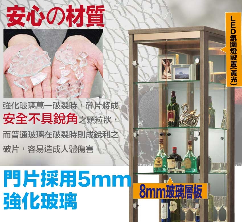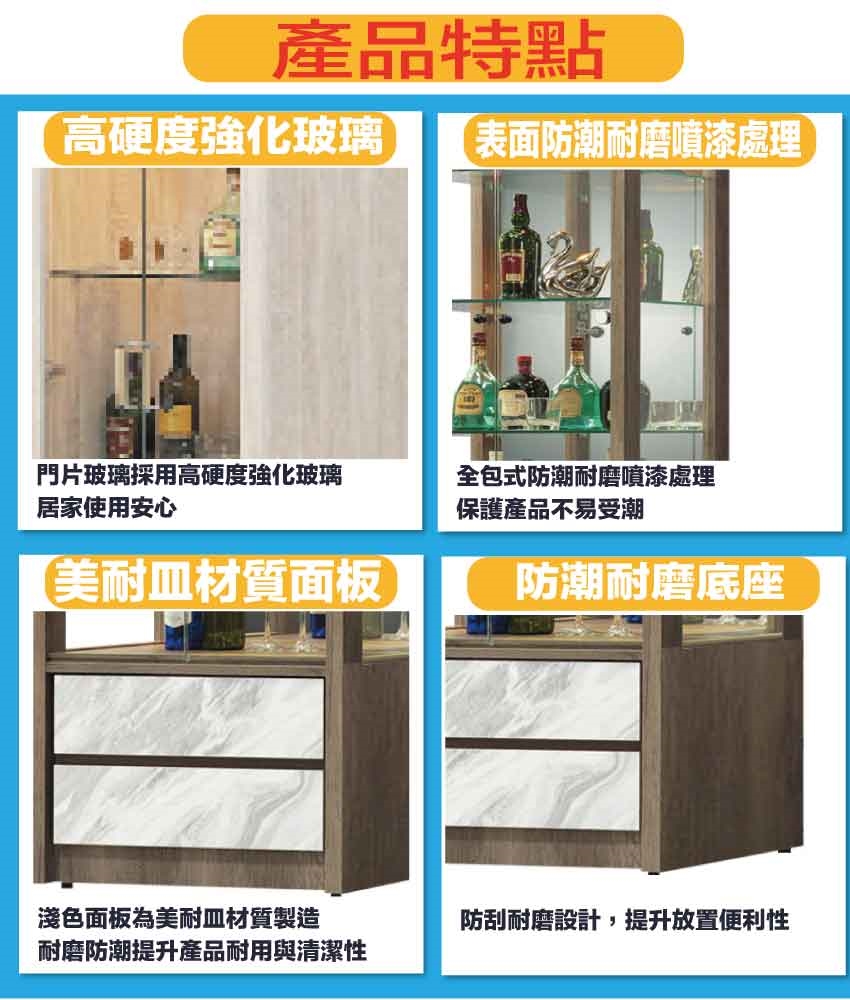 防蛀木心板+防潮耐磨底座(可調高低水平)+仿大理石紋路耐磨美耐皿面板+強化玻璃層板&門片+內置LED氛圍燈等安心材質製造