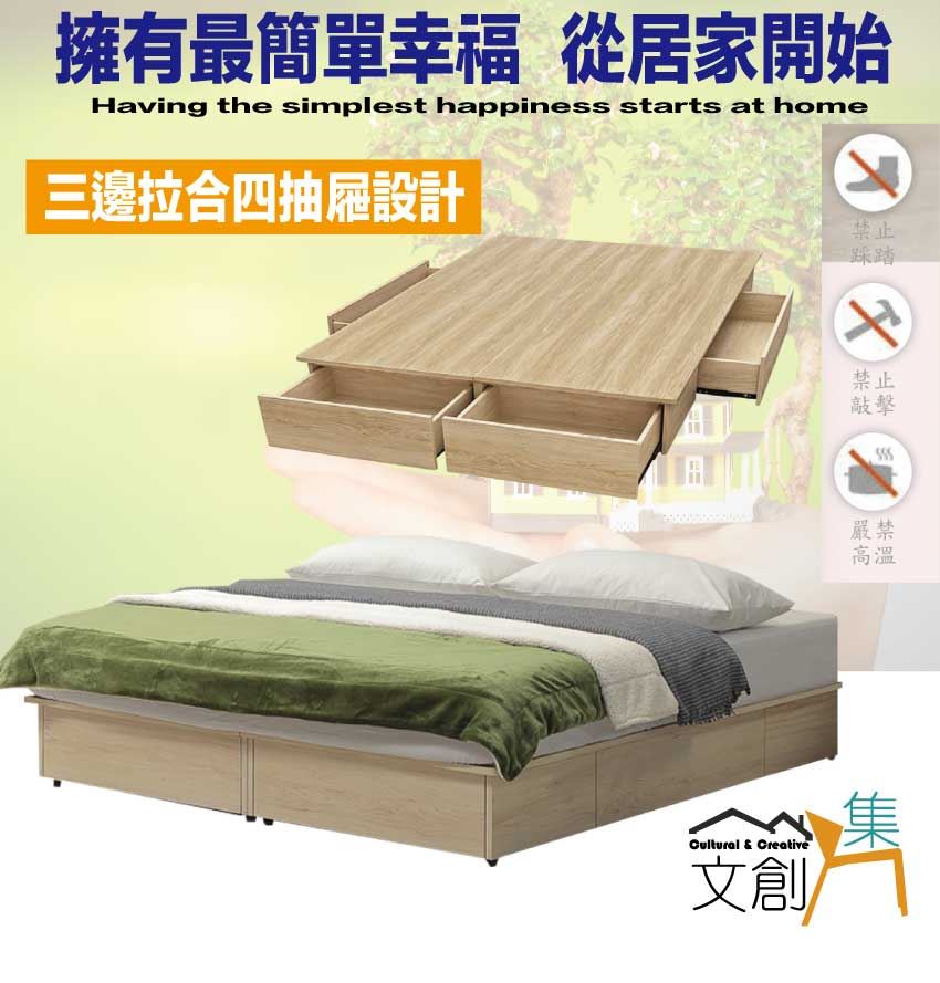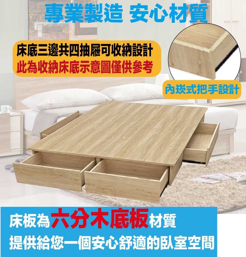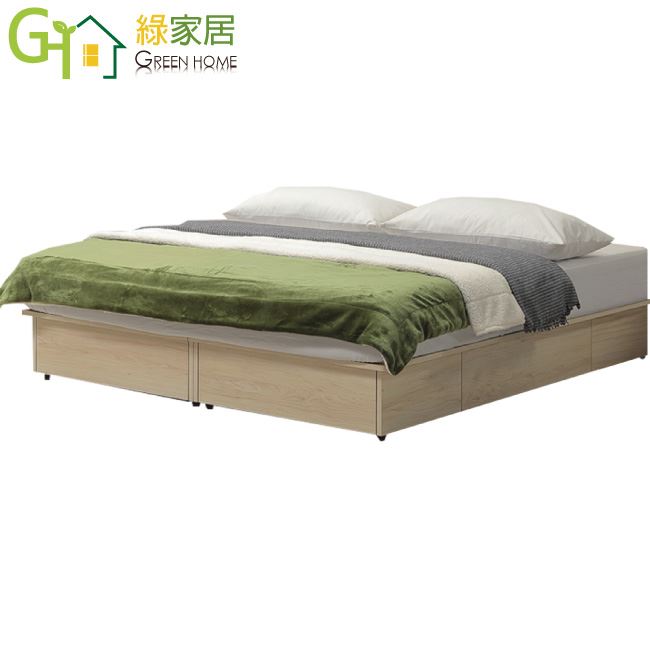 【綠家居】愛亞6尺雙人加大四抽屜收納床底(不含床墊)     橡木紋色系+現代簡約風格+安心材質製造,整體採用防蛀木心板+六分木床板+防潮耐磨底座等安心材質製造,產品外層採用防潮耐磨噴漆處理搭配採用床底座三邊開合抽屜收納空間設計,全由專人配送到家,專業安心服務,替你省下更多時間!