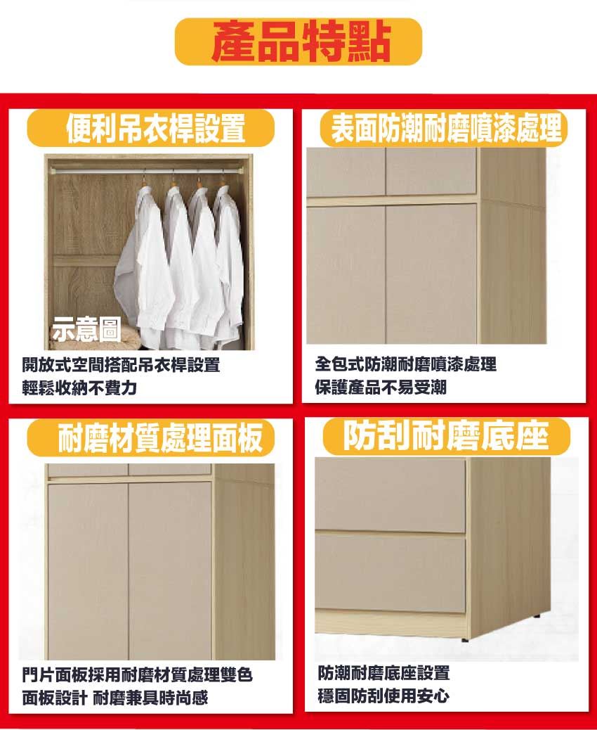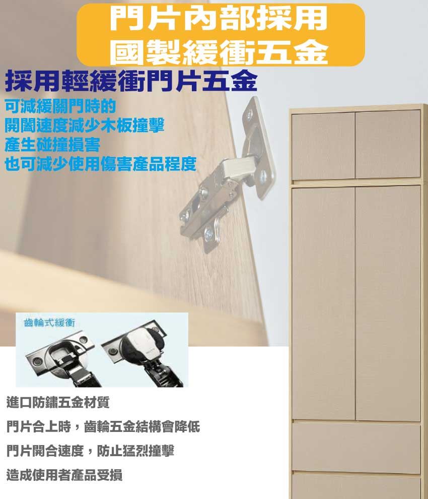 材質:防蛀木心板+防潮耐磨底座(可調高低水平)+防夾手緩衝門片五金