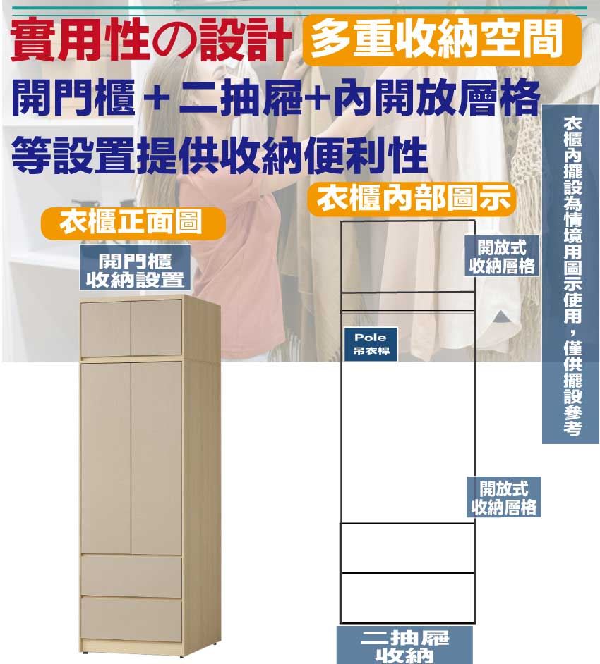 採用開門櫃+吊衣桿+二抽屜+內開放層格等收納空間設計