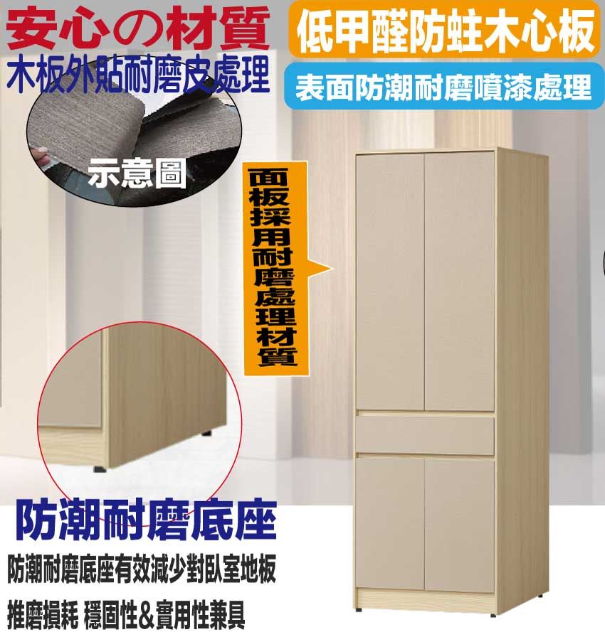 防蛀木心板+防潮耐磨底座(可調高低水平)+防夾手緩衝門片五金等安心材質製造