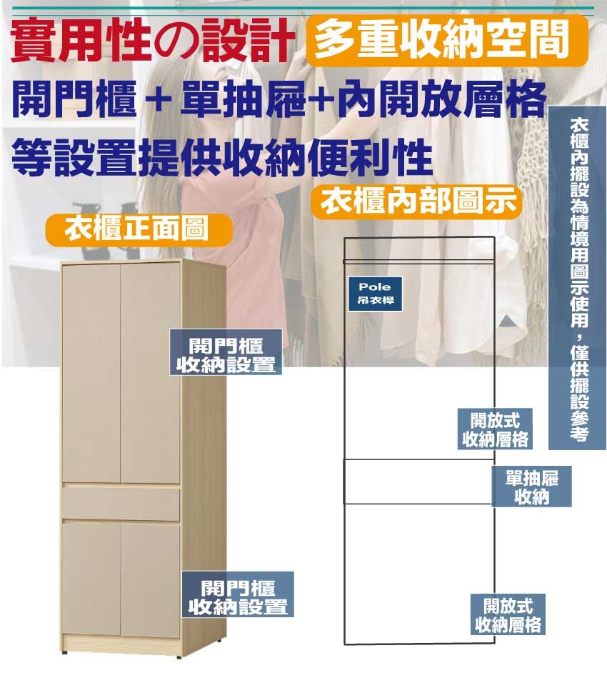 採用開門櫃+吊衣桿+單抽屜+內開放層格等收納空間設計
