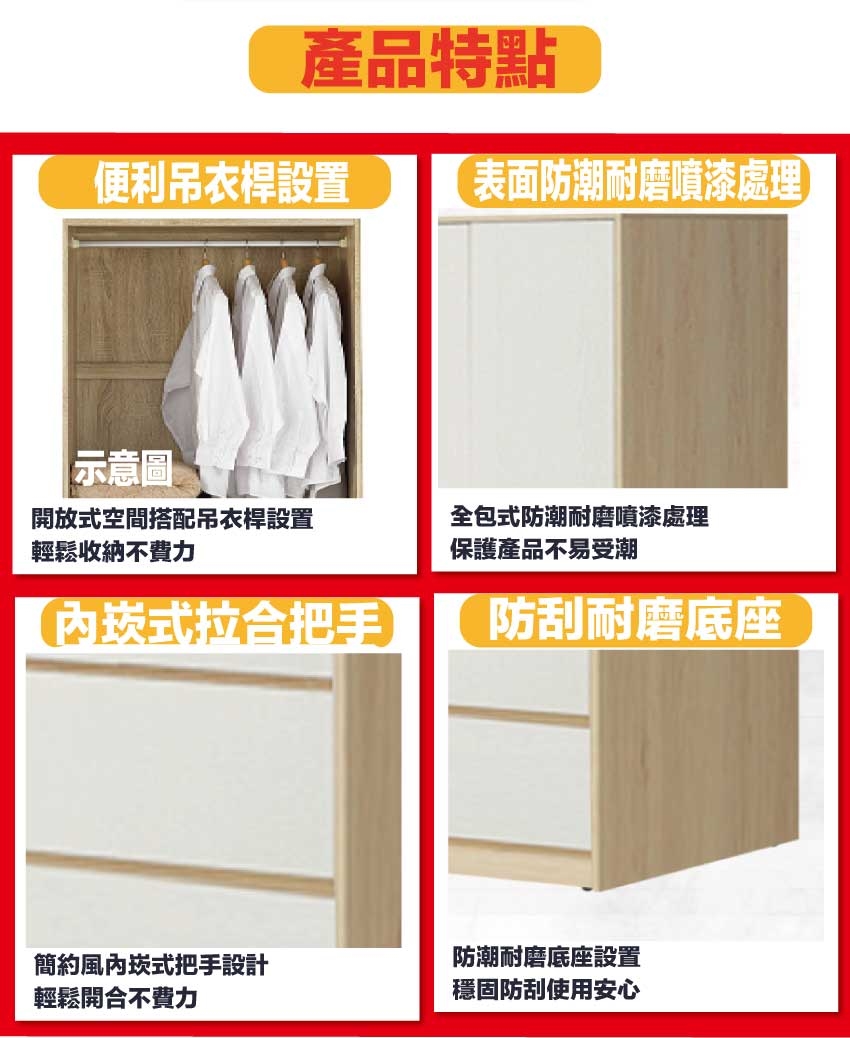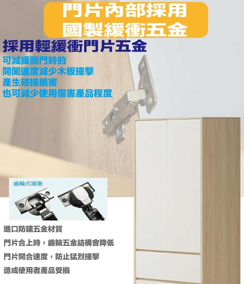 材質:防蛀木心板+防潮耐磨底座(可調高低水平)+防夾手緩衝門片五金