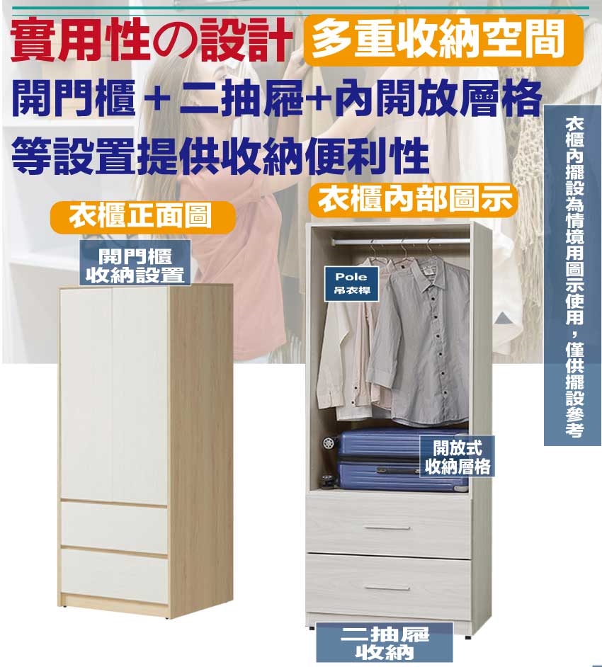 採用開門櫃+吊衣桿+二抽屜+內開放層格等收納空間設計