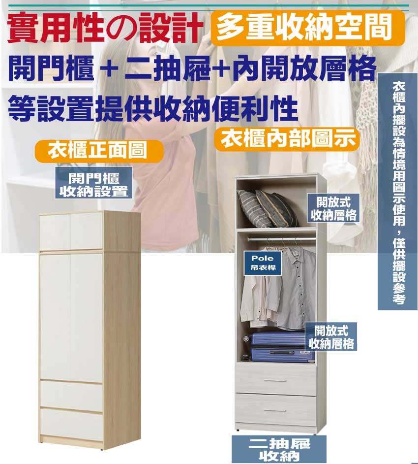 採用開門櫃+吊衣桿+二抽屜+內開放層格等收納空間設計